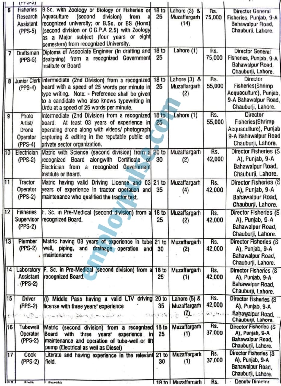 The government of the Punjab has announced many vacancies in the Department of Fisheries. Interested candidates who want to apply in the Fisheries Department, please register online at the official website of the Punjab Government. Scales of recruitment in the Fisheries Department from PPS 2 to PPS 7. The vacancies announced by the Government of Punjab in the Department of Fisheries are on a pure contract basis for a period of two years and may be extendable according to the project requirement. The posts announced in the Fisheries Department include Senior Budget Account Officer, IT Expert, Aquaculture Engineer (Civil), Graphic Designer, Assistant Aquaculture Engineer (Civil), Fisheries Research Assistant, Draftsman, Junior Clerk, Photo Artist Drone Operator, Electrician, Tractor Operator, Fisheries Supervisor, Plumber, Laboratory Assistant, Driver, Tubewell Operator, Cook, Mali, Naib Qasid, Lab Attendant, Mali, Sweeper, Chowkidar, and Beldar/Fisherman cum Beldar. The last date to apply for the announced vacancies of the Fisheries Department of the Government of Punjab is 31st January 2025. The total number of posts in the Fisheries department is about 95.